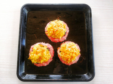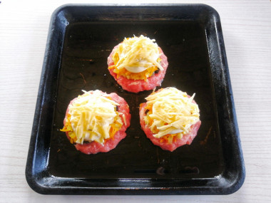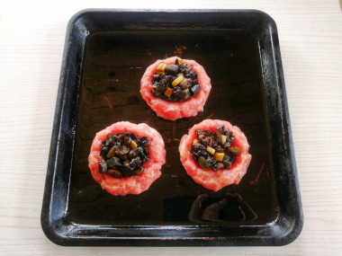 Форму для запекания смазываем растительным маслом. Смоченными водой руками из фарша формируем плоские лепешечки, делаем в центре каждой небольшую выемку. Лепешки из фарша кладем в форму для запекания.