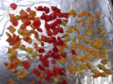 Решила в этом году запастись овощами на зиму. Причем меня интересовали способы, которые по максимуму сахранят полезные вещества. Заморозку я уже пробовала, а вот предложенный в этом рецепте способ сушки болгарского перца на зиму - еще нет. Перец нарезала кусочками со сторонами примерно 1 сантиметр. Сушила в духовке на самом маленьком огне с открытой дверцей. Протвинь застелила фольгой и разместила её на средней полочке. На сушку ушло больше пяти часов. Досушила перцы до состояния ломкости кусочков.