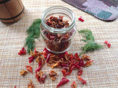 Подсушивайте измельченный болгарский перец в течение нескольких часов до получения абсолютно сухих, легких, несколько шелестящих лепесточков. Они могут немного присохнуть к поверхности формы, однако легко отделяются руками или деревянной лопаткой. Готовый сушеный болгарский перец храните в сухом месте в чистой емкости. Не стоит герметично укупоривать такую емкость, чтобы перец не запрел. Удачной заготовки!