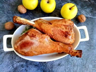 К ужину запекла голень индейки в духовке в рукаве. Очень люблю всякое мясо, приготовленное в рукаве, оно всегда получается мягким и сочным. Что касается этого рецепта, у меня было две голени общим весом 1,2 кг. Как раз хватило на четырёх человек. Для маринада я взяла все ингредиенты по рецепту, заменив дижонскую горчицу обычной домашней и добавив ложку кетчупа. Чеснока взяла в два раза больше. Голени мариновались в пакете почти сутки в холодильнике. Периодически их переворачивала, чтобы маринад лучше пропитал мясо. Запекала тоже 1,5 часа при 180°. Индейка получилась очень ароматной, с остринкой! К тому же невероятно мягкой, сочной и вкусной. Мясо буквально отстает от кости!