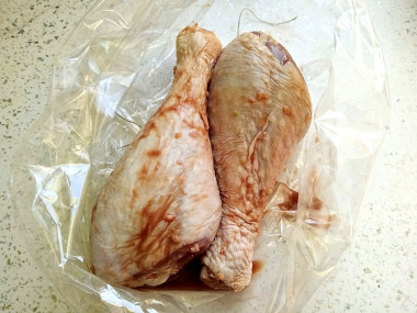 Обмажьте ножку индейки со всех сторон маринадом. Поставьте мясо мариноваться на ночь в холодильник. Накройте его сверху крышкой или пищевой пленкой.