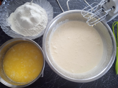 Готовое тесто должно оставаться пышным и воздушным за счет хорошо взбитых яиц. Теста получится много, поэтому изначально чаша должна быть большого объема.