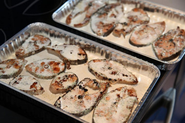 Снимите кожу, удалите хребет и кости, нарежьте рыбу на порционные кусочки.