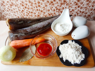 Калорийность продуктов: Сметана, Морковь, Минтай, Лавровый лист, Растительное масло, Томатная паста, Соль, Вода, Лук репчатый, Пшеничная мука, Смесь трав