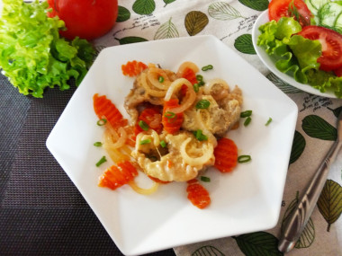 Приготовила минтай лук, морковь, томатная паста. Подготовленные кусочки минтая обжарила в мучной панировке. Пока рыба обжаривалась, нарезала лук и морковь, добавила нарезанные овощи к рыбе. Для соуса в сметану решила вместо томатной пасты добавить готовый кетчуп, для более пряного и насыщенного вкуса. Полученным соусом залила рыбу с овощами, тушила до готовности. Очень вкусно!!! Спасибо за рецепт, naniki!