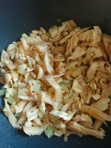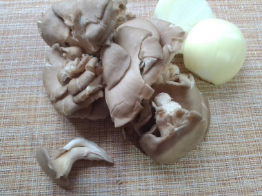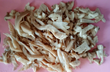 Вешенки нарезаем соломкой. Сильно мелко нарезать не нужно, так как грибы имеют свойство после тепловой обработки уменьшаться в размере. Я брала две "веточки" вешенок на ножке - как раз вышло пол килограмма.