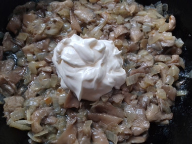 Добавляем в сковороду сметану хорошего качества. Я купила сметану, на упаковке которой было написано, что она изготовлена из настоящего молока - она не свернулась, в общем, не подвела и не испортила блюдо.