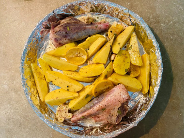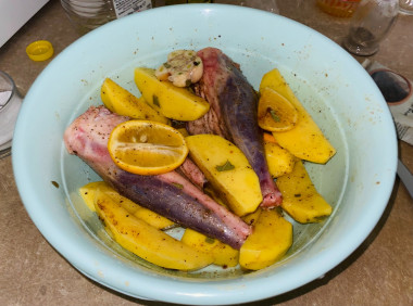 Соедините в глубокой миске баранину, картофель, лимон, чеснок, масло, тимьян, соль и специи. Все хорошо перемешайте.
