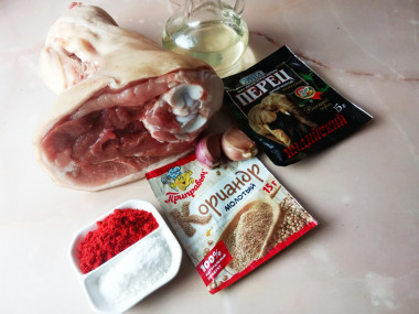 Калорийность продуктов: Рулька свиная, Растительное масло, Чеснок, Паприка, Молотый кориандр, Перец черный молотый, Соль