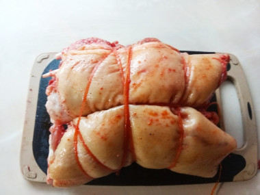 А затем положите сверток в рукав для выпечки, завяжите его с обеих сторон. Уберите рулет в холодильник минимум на 2 часа для маринования. Лучше подержать его там в течение суток. За полчаса до окончания маринования включите духовку на 180 градусов.