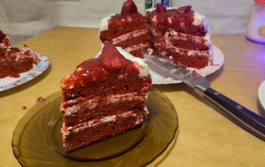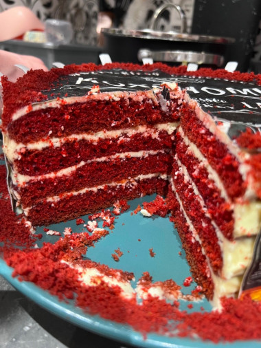 Торт получился просто супер!! Коржи красные, красивые вышли, единственное долго не могли пропечься внутри и, в итоге, верхушка подгорела, наверное надо было послабее ставить печку, ещё для себя усвоила урок что перед тем как коржи мазать кремом они должны остынуть, а то весь крем потечёт 😅, но, осознав ошибку, всё вышло очень даже неплохо, а главное вкусно, огромное спасибо за рецепт!!!