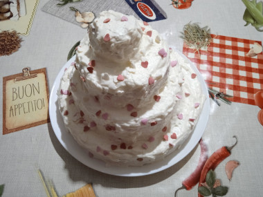 Очень вкусный торт! Коржи мягкие, пористые, их даже не надо пропитывать. Крем густой, хорошо держит форму. Я бы увеличила его количество, чтобы обмазать торт более толстым слоем.