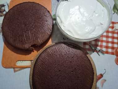 Готовый корж остудите. Я его остужаю сначала на решетке, потом заворачиваю в пищевую пленку и убираю на 6-8 часов в холодильник. После чего разрежьте корж на три части. У меня сильно поднялась шапочка на бисквите, я ее срезала и использовала для украшения.