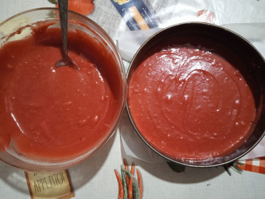 Подготовьте формы для выпечки. Торт можно печь отдельными коржами, тогда понадобятся 3 формы. Я пекла в кольце, его диаметр 20 см. Дно сделала из двойного слоя фольги. Разлейте тесто по формам — трем или одной, как у меня. Формы предварительно смажьте небольшим количеством растительного масла.