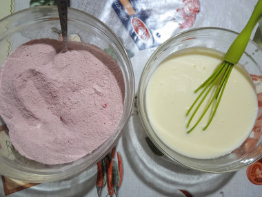 В другую миску разбейте яйца. Влейте кефир и растительное масло. Немного кефира оставьте. Влейте в него гелевый краситель и перемешайте. Количеством красителя можно также регулировать цвет коржей. Чем его больше, тем насыщеннее цвет. Имейте в виду, что после выпечки цвет поблекнет. Вылейте окрашенный кефир в миску. Добавьте уксус и ванильный экстракт, если используете его.