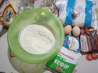 Просейте в большую миску муку и какао. Добавьте сахар, соду и соль. Какао добавляют для усиления цвета коржей. Если любите более шоколадный вкус, добавьте его больше, но тогда цвет коржей будет темнее. Можете добавить еще ванилин. Имейте в виду, что муки у вас может уйти больше или меньше, чем у меня. Ориентируйтесь по консистенции теста. О свойствах муки читайте в статье в конце рецепта.