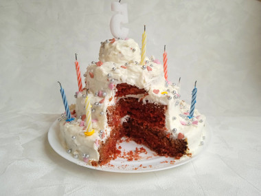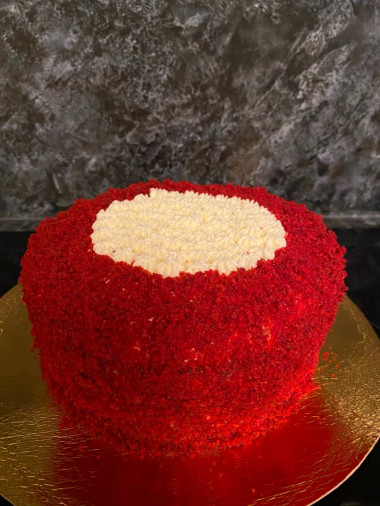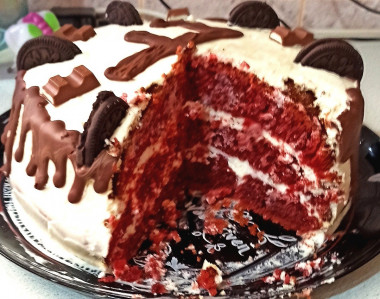 Сделала торт Красный бархат классический в домашних условиях по этому рецепту. Готовила сыну на 5 лет. Для теста использовала пищевой красный краситель. Соединила все сухие ингредиенты, отдельно смешала все остальные продукты. Соединила обе массы. Получилось густое, однородное и красное тесто. Выпекала два бисквита диаметром 22 см. Приготовила для красного бархата простой сметанный крем. Остывшие бисквиты нарезала кругами разного диаметра, задумка была сделать многоярусный торт. Бисквит получился внутри влажный, мягкий, сладкий и бордовый. Собрала торт, перемазывая кремом. Украсила декоративными шариками и сердечками. Получилось невероятно красиво. Торт ночь пропитывался в холодильнике. Очень вкусно и оригинально. Рецепт простой и совершенно лёгкий в приготовлении. Необыкновенный торт порадовал ребенка и не только. Сверху белый, а внутри красный. По вкусу мне напомнил торт трухлявый пень. Замечательный рецепт! Всем советую попробовать сделать такой торт. Большое спасибо автору 😀