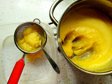 Затем в яичную смесь введите горячий сок. Делайте это постоянно помешивая венчиком.Вливайте потихоньку, тоненькой струйкой, чтобы не свернулись яйца. Далее поставьте кастрюльку на средний нагрев и варите до загустения крема, примерно около 4 минут.