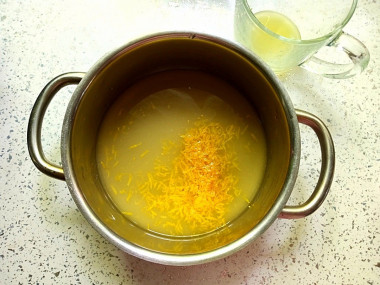 В остальной сок добавьте всю цедру и 1/2 сахара, перемешайте и нагрейте до кипения, но не кипятите. Это достаточно быстро, не отходите и помешивайте, чтобы сахар весь растворился, но не подгорел.