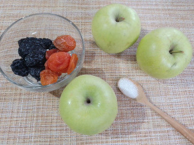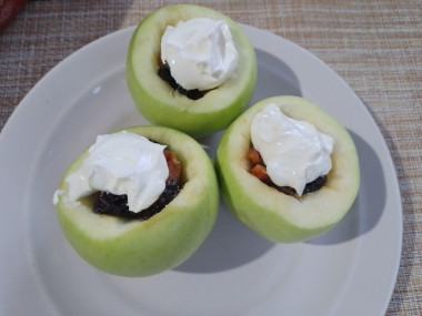 Яблоки поставьте в форму для запекания. Каждое яблоко начините измельченными черносливом и курагой. Сверху, кто любит сладкие десерты, может присыпать немного сахара. Ложкой в каждое яблоко на начинку выложите сметану. Чтобы форма не испачкалась вытекающим сладким соусом, лучше застелить ее пергаментом.