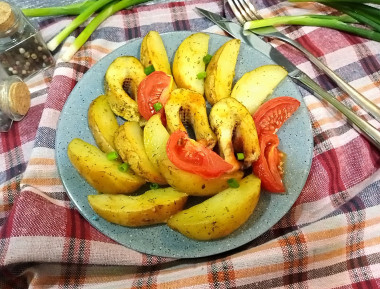 Картошку тщательно вымойте с помощью губки. Обсушите клубни бумажным полотенцем и нарежьте крупными дольками. Лук очистите и ополосните.