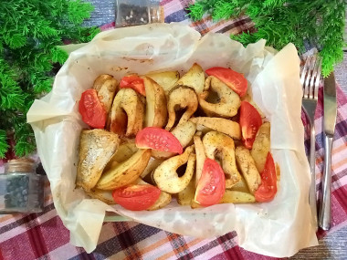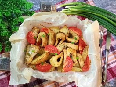 Запекала при 200°С примерно час. У меня картошка получилась в несколько слоев, поэтому дольше пропекалась. Лучше разложить дольки в один слой. Вместо черри взяла обычный помидор, который нарезала дольками, выложила его за 20 минут до готовности.