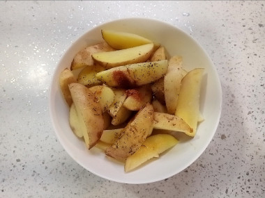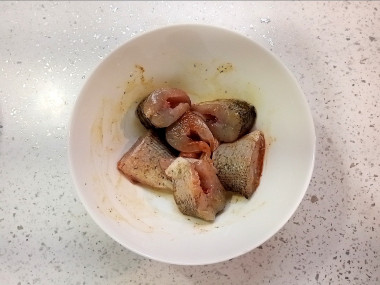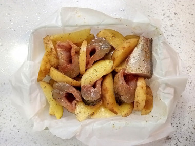 Мне понравилось, что все делается быстро и просто. Картошку тщательно промыла щеткой, обсушила и нарезала дольками. Рыбу тоже промыла, обсушила и нарезала на кусочки.