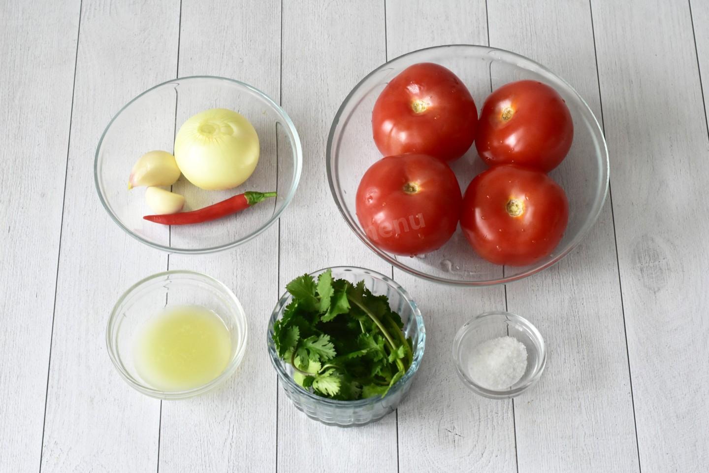 В чаше блендера соедините лук, чеснок и перец чили. Взбейте до получения мелких кусочков. Добавьте помидоры и взбейте импульсами в течение 1-2 минут, стараясь, чтобы в соусе сохранились мелкие кусочки. Добавьте сок лайма, кинзу и соль и слегка взбейте. Однородность соуса делайте по своему вкусу.