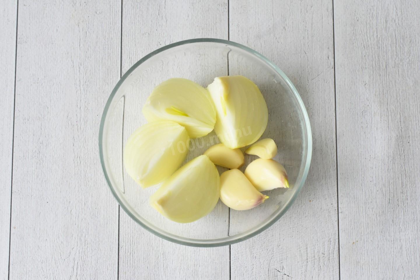 Луковицу очистите и разрежьте на 4 части. Зубчики чеснока очистите. Если зубчики крупные, разрежьте их пополам. Острый перец несколько раз проколите вилкой.