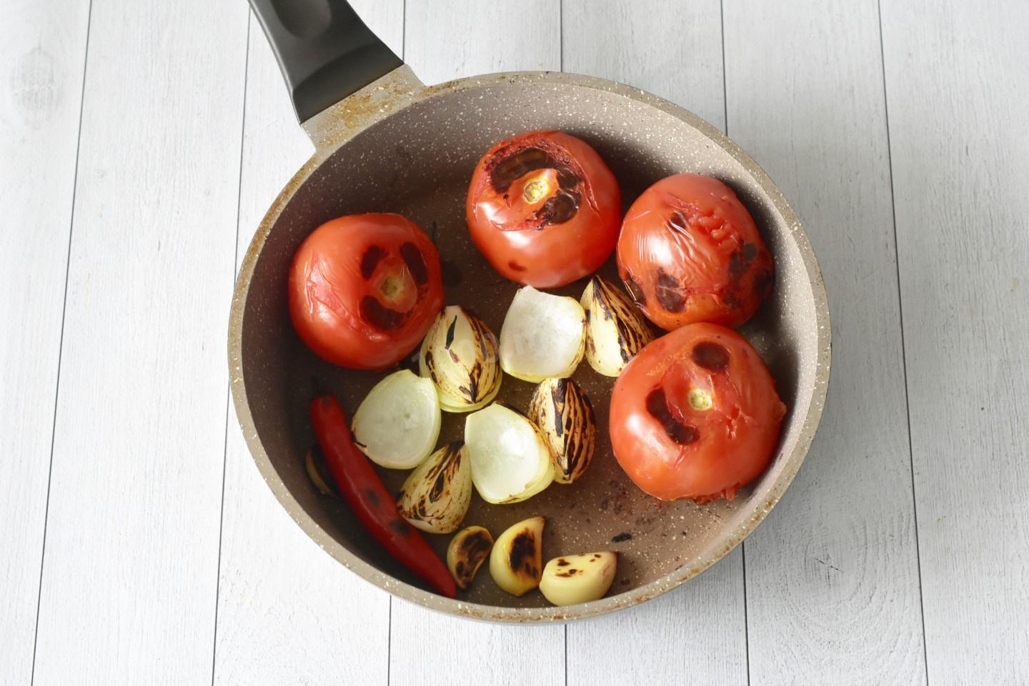 Сковороду прогрейте на сильном огне. Выложите помидоры, лук, чеснок и целый перец чили. Обжарьте овощи, периодически переворачивая, около 10 минут до появления подпалин. Овощи переложите на тарелку и охладите. У перца чили удалите семена и плодоножку. У помидоров удалите кожуру. Вместо обжаривания, можете запечь овощи в фольге в духовке.