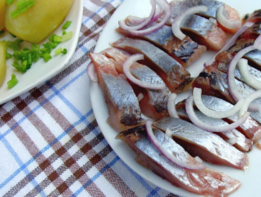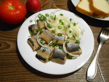 Готовую рыбу достаньте из рассола, обсушите, отрежьте голову и хвост. Разрежьте брюшко, выньте внутренности. Нарежьте тушку на кусочки. Подавайте к столу с луком, зеленью и душистым маслом. Приятного аппетита!