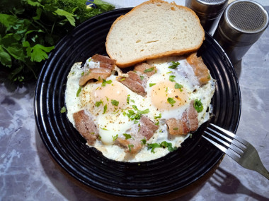 Понравился мне рецепт "яичница с беконом на сковороде", тоже захотелось приготовить на завтрак сытное блюдо. Только вместо бекона я взяла свежую грудинку. Нарезала небольшими кусочками мясо с прослойкой сала и обжарила с двух сторон. Вбила яйца, добавила соль и перец. Готовила под крышкой до готовности белка, но чтоб желтки остались жидкими. Сразу переложила яичницу на блюдо и посыпала свежей измельчённой петрушкой. Перед подачей ещё немного посыпала свежемолотым черным перцем. Аромат потрясающий! Готовить очень быстро и просто! Завтрак получился сытным, вкусным и красивым. Моя грудинка получилась сочной, а в дополнении с яйцами просто объедение. Это действительно заряд бодрости на целый день! Отличный рецепт! Благодарю автора 😊