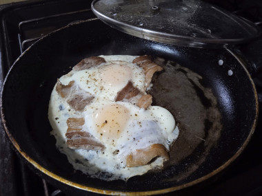Кухонной лопаткой отодвиньте кусочки бекона в стороны. В центр сковороды аккуратно разбейте яйца, стараясь сохранить желтки целыми. Как понять свежее ли яйцо? Разбейте его в отдельную емкость. Должен отсутствовать неприятный запах. Белок свежих яиц будет прозрачным и чистым. Желток не должен растекаться и будет блестящим, выпуклым. Посолите и поперчите яичницу по вкусу. Жарьте на среднем огне около 5 минут. При этом желток должен остаться полужидким.