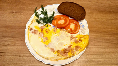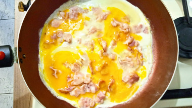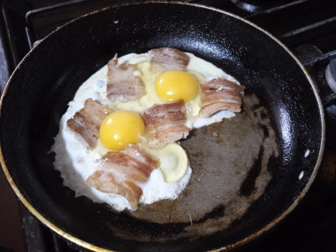 Отличный завтрак получился по этому рецепту. Быстро на сухой сковороде обжарила бекон, когда начал вытапливаться жир, разбила в сковороду яйца. Мой муж не любит непрожаренный желток, поэтому я всегда желток разбиваю. Яичница жарилась на среднем огне буквально пару минут. Подавала с помидорами и черным хлебом. Это очень быстрый, сытный и вкусный завтрак.