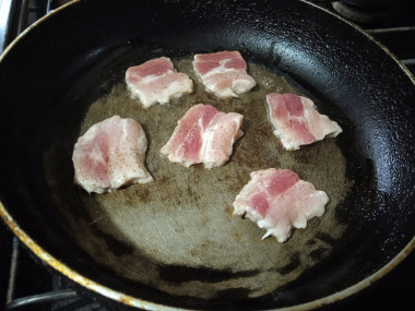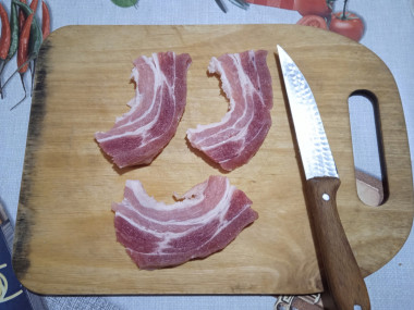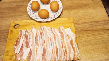 Бекон нарежьте тонкими ломтиками. Чем тоньше, тем лучше. В идеале лучше использовать готовую нарезку, купленную в магазине. Бекон можно нарезать совсем мелко, а можно и покрупнее, кому как нравится.