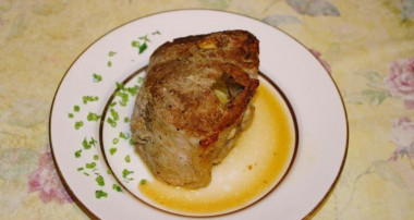 В мясе сделала надрезы, в которые вставила пластинки чеснока. Обмазала маринадом, положила в миску и накрыла фольгой. Убрала в холодильник на ночь.
