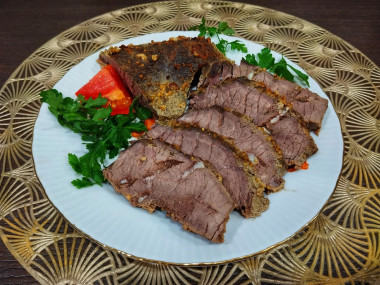 Готовая говядина должна быть мягкой и легко протыкаться ножом. Достаньте мясо из духовки, дайте ему немого остыть, переложите на разделочную доску и тонко нарежьте на порционные куски. Выложите говядину на тарелку, украсив при желании зеленью. На гарнир можно подать овощи, макароны, рис. Приятного аппетита!