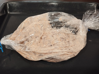 На следующий день,ближе к обеду, выложила мясо в рукав для запекания, защепнула клипсами с двух сторон и отправила запекаться в духовой шкаф на 2ч при 180°.