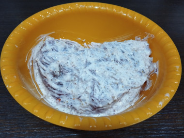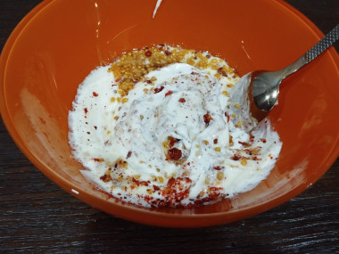 Для маринада смешайте в небольшой емкости сметану с горчицей, добавьте соль и перец (я добавляла смесь перцев). Чеснок порежьте вдоль на половинки или четвертинки. Сметану можно заменить жирными сливками или натуральным густым йогуртом без добавок.