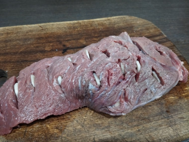 В мясе сделайте по всей площади надрезы ножом и вставьте в них чеснок.