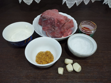 Как запечь мягкую и сочную говядину в рукаве целым куском в духовке? Подготовьте указанные ингредиенты. Маринад для запекания говядины в рукаве можно брать на ваш вкус. Я выбираю маринад из сметаны и горчицы в зернах. Для аромата добавляю чеснок. Соль, перец по вкусу.