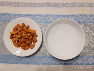 Как сделать миндальное молоко без сахара в домашних условиях? Подготовьте все ингредиенты. Сам процесс приготовления миндального молока составляет, буквально, пару минут, но подготовить орехи к этому процессу нужно заранее. Орешки тщательно промойте, положите в миску и залейте холодной чистой водой. Оставьте орехи замоченными на ночь. Утром воду слейте. Миндаль должен разбухнуть. Еще раз хорошо промойте орехи водой.