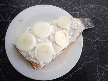 Искала на любимом сайте, что можно приготовить из целой рыбы. Нас угостили свежим карпом. Решила приготовить блюдо по этому рецепту. Рыба в сметане в духовке запеченная мне понравилась своими составляющими. Сметана и лук прекрасно сочетаются с рыбой. Почистила карпа, отрезала голову по своим соображениям, посолила и поперчила, чуть добавила лимонной приправы для рыбы. Лимонным соком не сбрызгивала. Нашпиговала карпа кольцами лука. Смазала сметаной, от себя в соус добавила измельчённой петрушки. Под карпа и сверху уложила кольца лука. Запекала рыбу 25 минут при 180 С не переворачивала. Аромат при запекании был волшебный. Первый раз готовила рыбу без лимона, результат превзошел мои ожидания. Карп не только красиво смотрится на блюде, ещё имеет безумный аромат и сногсшибательный вкус. Рыбка моя конечно костлявая, но вкус великолепен. Сметанный соус отлично подчеркивает рыбное белое мясо. Лук хорошо пропёкся и заменил нам гарнир. Особенно вкусный лук был тот, который лежал под рыбой. Луковые кольца, которые были сверху, получились хрустящими. Отличный рецепт! Забрала себе в копилку и всем рекомендую попробовать! Огромное спасибо автору!