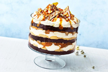 Десерт трайфлы в стаканчиках Сникерс, который впечатляет! Это любовь с первой ложки, идеальное угощение для дружеской вечеринки, детского праздника (версия без ликера), особенно если эти дети - подростки. Да и многим взрослым придутся по душе такие слоеные пирожные, помещенные в порционные стаканчики. А можно и в большую вазу. Очень сладко, очень вкусно! Я бисквит не нарезала на мелкие кусочки - сделала такой минитортик в стакане.