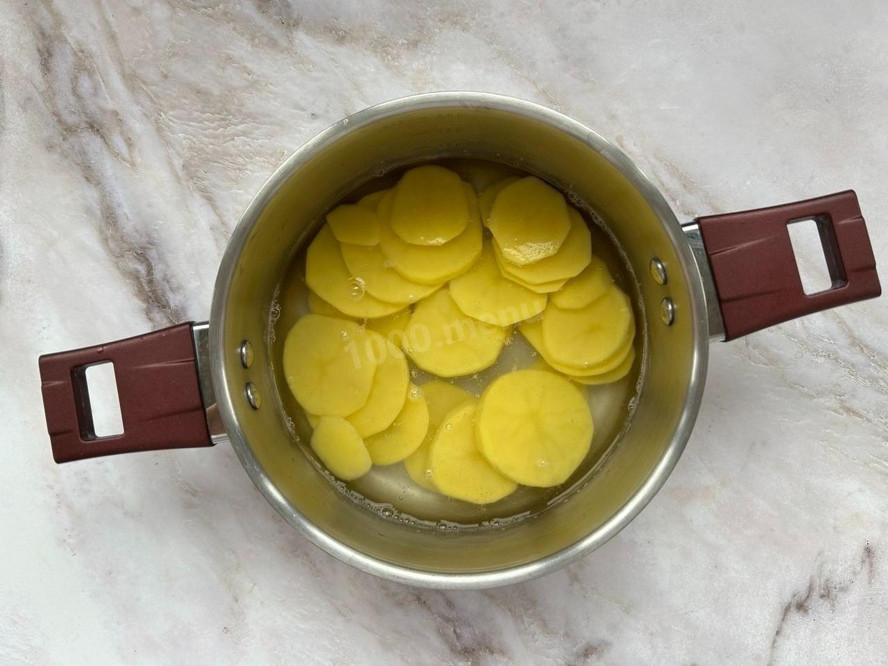 Картофельные кружочки переложите в кастрюлю, залейте водой так, чтобы они были ей полностью покрыты и поставьте кастрюлю на средний огонь. Когда вода закипит, убавьте нагрев до умеренного и варите картофель примерно 5 минут. Воду чуть-чуть подсолите. Когда пройдет время, снимите кастрюлю с огня, слейте воду и пока оставьте картофель в стороне. С выбором сорта картошки и кастрюли для варки вам помогут статьи под рецептом.