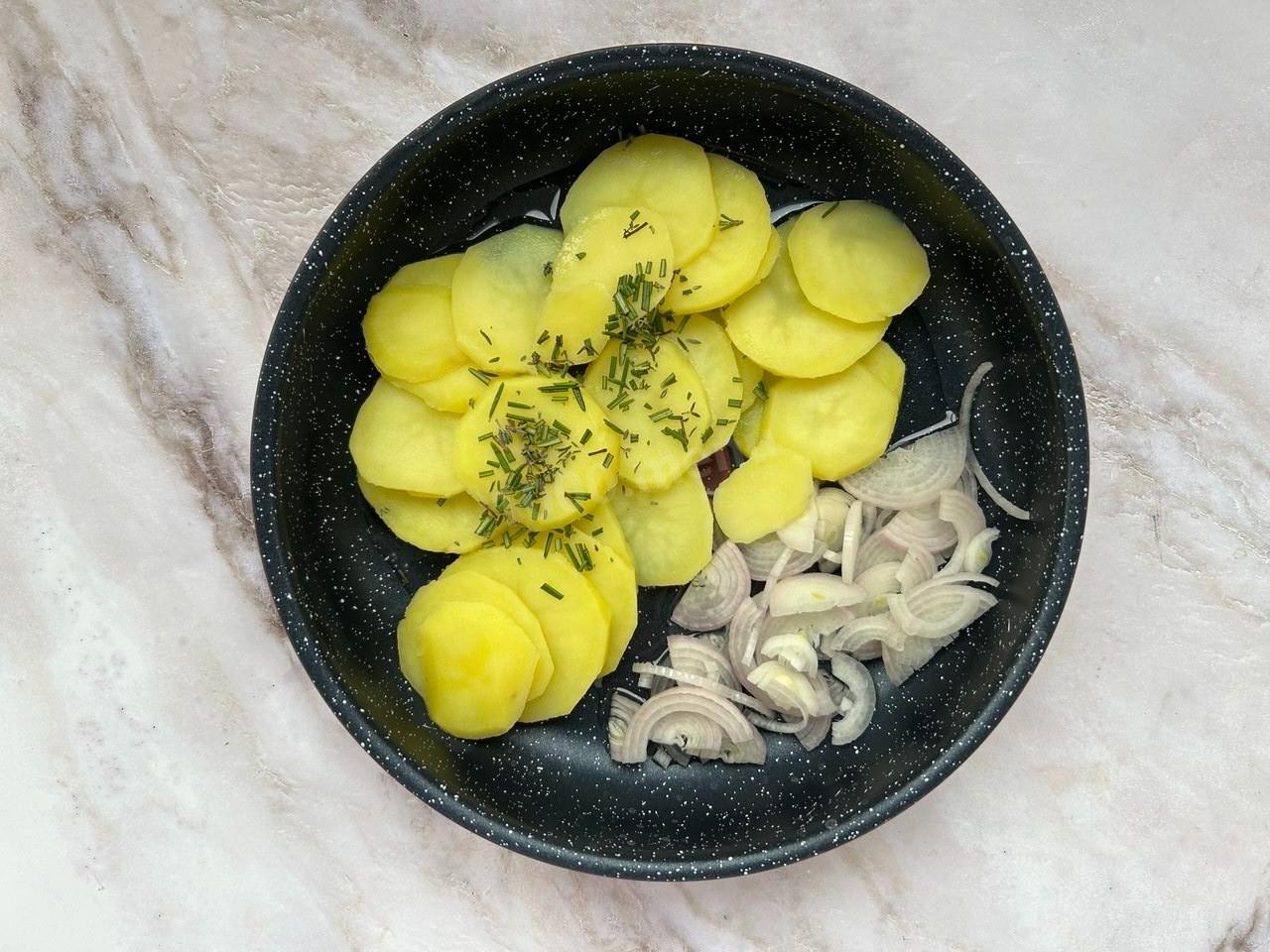 Сковороду среднего размера поставьте на средний огонь, налейте в нее оливковое масло, хорошо его разогрейте. Выложите в разогретое масло нарезанный лук-шалот, нарубленную зелень и наполовину готовые кружочки картофеля. Перемешивайте и готовьте все вместе примерно 3-4 минуты, в процессе добавляя соль. За это время картофель должен прожариться до готовности, а лук-шалот стать прозрачным и немного золотистым. Время от времени помешивайте содержимое сковороды.