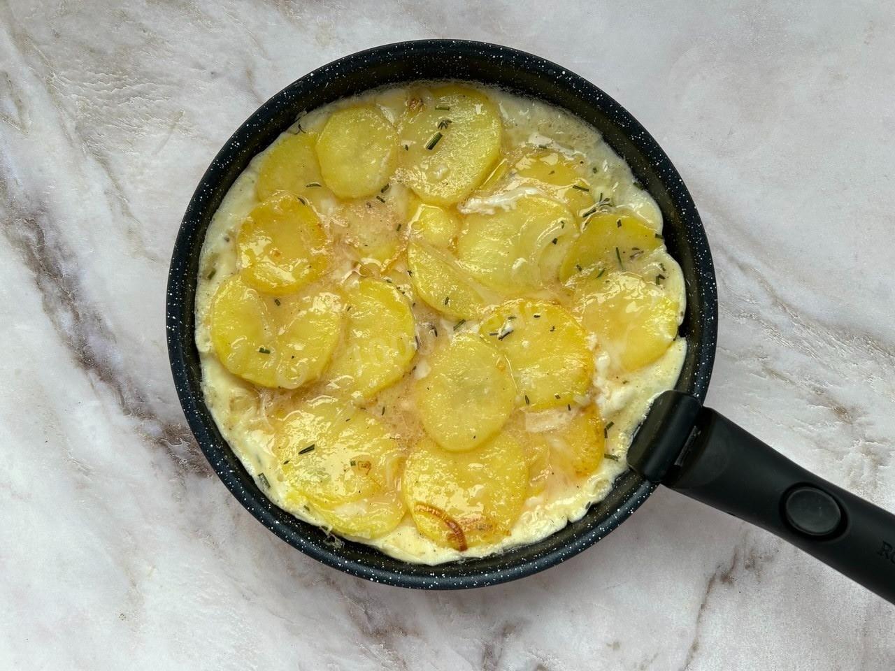 Фриттата классическая - это очень сытный завтрак. Варила вчера картошку в мундире на салат и заодно отварила на фриттату, чтоб быстрее утром сварганить блюдо. Лук обжарила, добавила порезанный отварной картофель и обжарила всё вместе. Яйца взболтала вилочкой с молоком, солью и перцем. Залила яично-молочной массой картошку с луком и готовила под крышкой на медленном огне до готовности. Вышло очень ароматно и аппетитно. Свежего розмарина не было, зато есть всегда на подоконнике зелёный лук. Завтрак удался на славу. Очень вкусно. А также просто и быстро. Благодарю автора за идею)