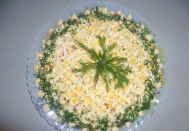 6. В салатник выложите нижним слоем натертые яйца, перемешанные с майонезом.