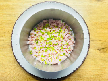 10. Последним слоем идет ветчина, также смажьте ее майонезом.