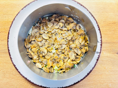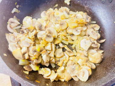 1. Лук обжарьте слегка в растительном масле, остудите, перемешайте его с маринованными грибами.